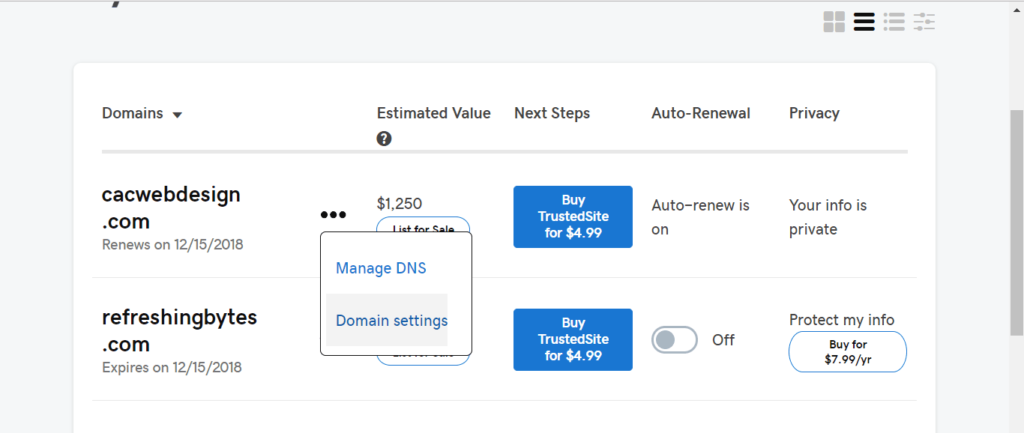- Login to Godaddy and choose manage my domains from the quick link menu.
